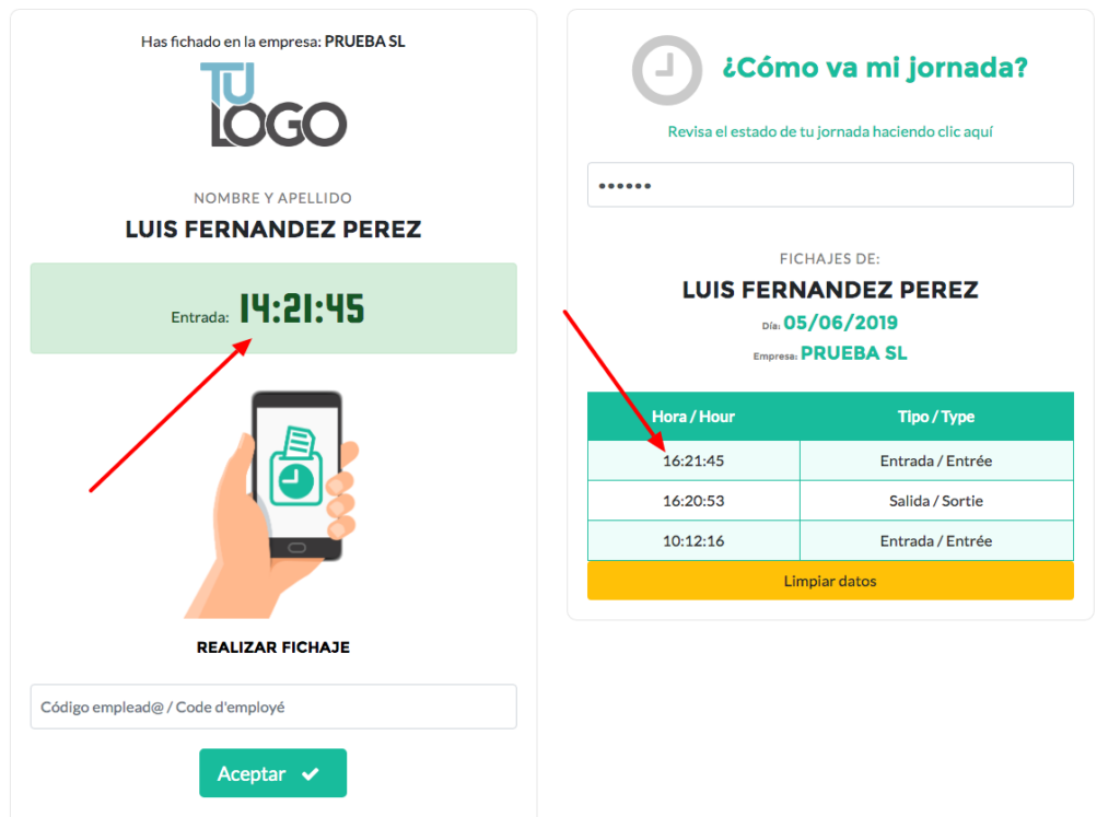 Solo tienes que introducir tu código y pulsar un botón para fichar.